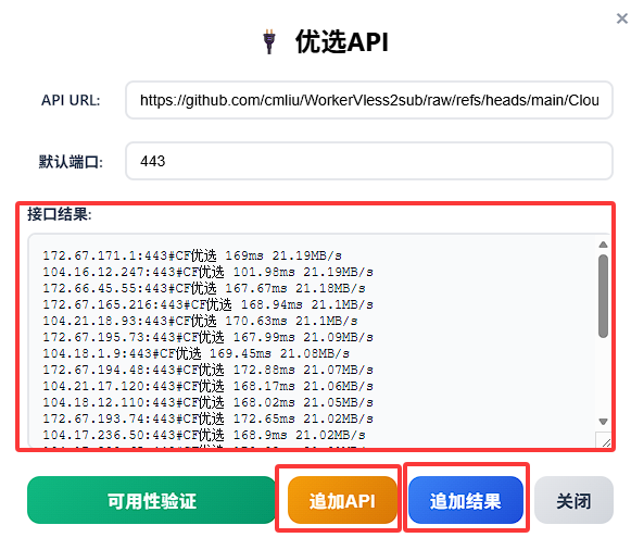 https://github.com/cmliu/WorkerVless2sub/raw/refs/heads/main/CloudflareSpeedTest.csv,填写测速对应的默认端口后,点击可用性验证按钮;如返回格符合